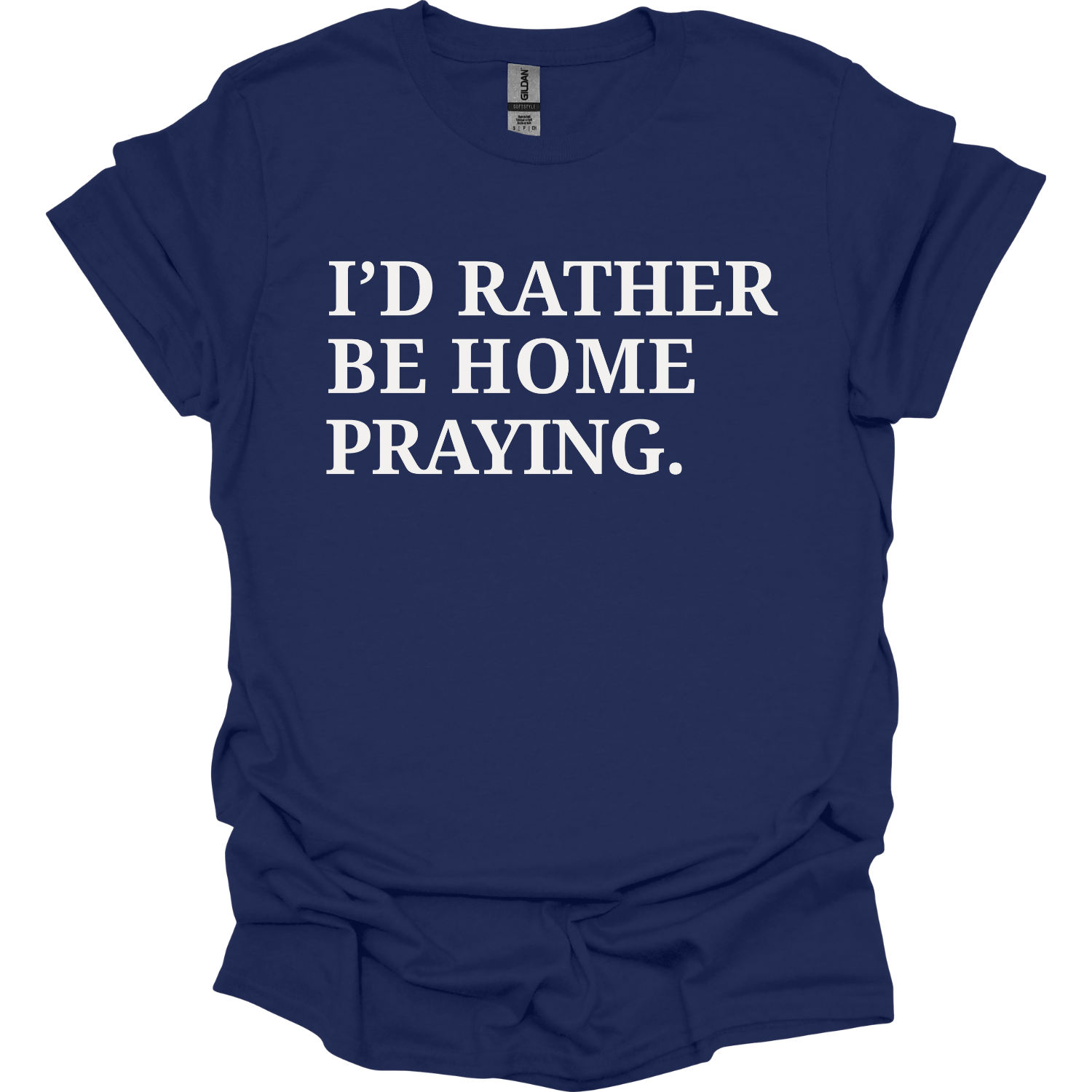 Show your faith with a playful touch wearing the "I'd Rather Be Home Praying" T-shirt.