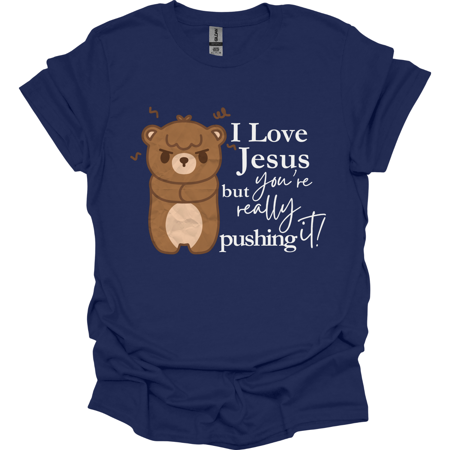 Express your bold faith with the "I Love Jesus But You're Really Pushing It" T-Shirt.